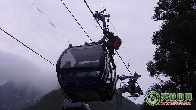 ?此次救援演練,由2名工作人員模擬游客被困在索道吊廂中。接到故障報(bào)告后,景區(qū)應(yīng)急救援指揮部迅速下達(dá)指令,救援隊(duì)、醫(yī)療急救等隊(duì)伍隨即攜帶裝備趕赴現(xiàn)場(chǎng)。2名主救人員爬上索道支架,將救援行走小車(chē)安裝到運(yùn)載索上,然后空中滑行至被困纜車(chē),協(xié)助被困游客系好救援安全帶利用緩降繩到達(dá)地面。游客降落后,地面的醫(yī)護(hù)人員立即對(duì)游客進(jìn)行救護(hù)、心理安撫等。整個(gè)救援過(guò)程用時(shí)22分50秒。